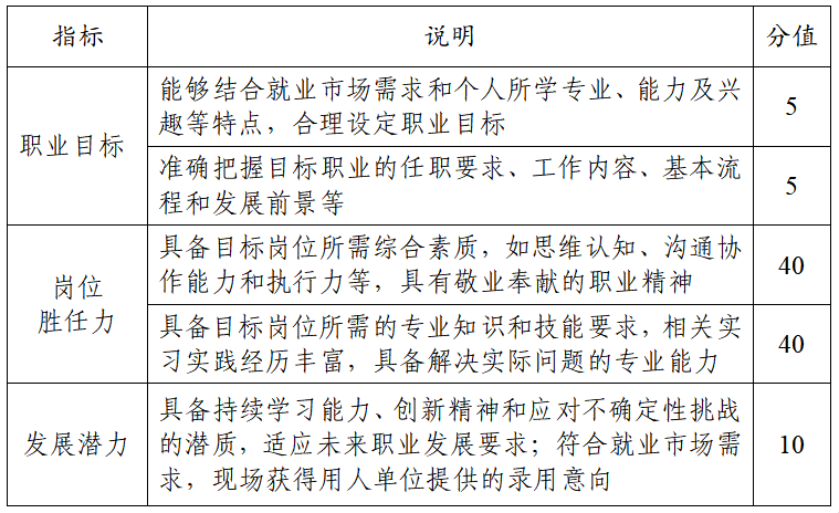面向学院本科三、四年级学生(不含已通过推免等确定升学的毕业年级学生)。重在考察学生求职实战能力,对照目标职业及岗位要求,个人综合素质和专业能力等方面的契合度,个人发展路径与就业市场需求的适应度。