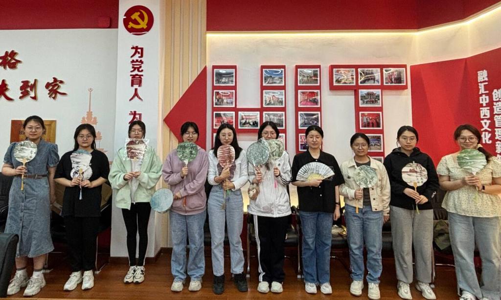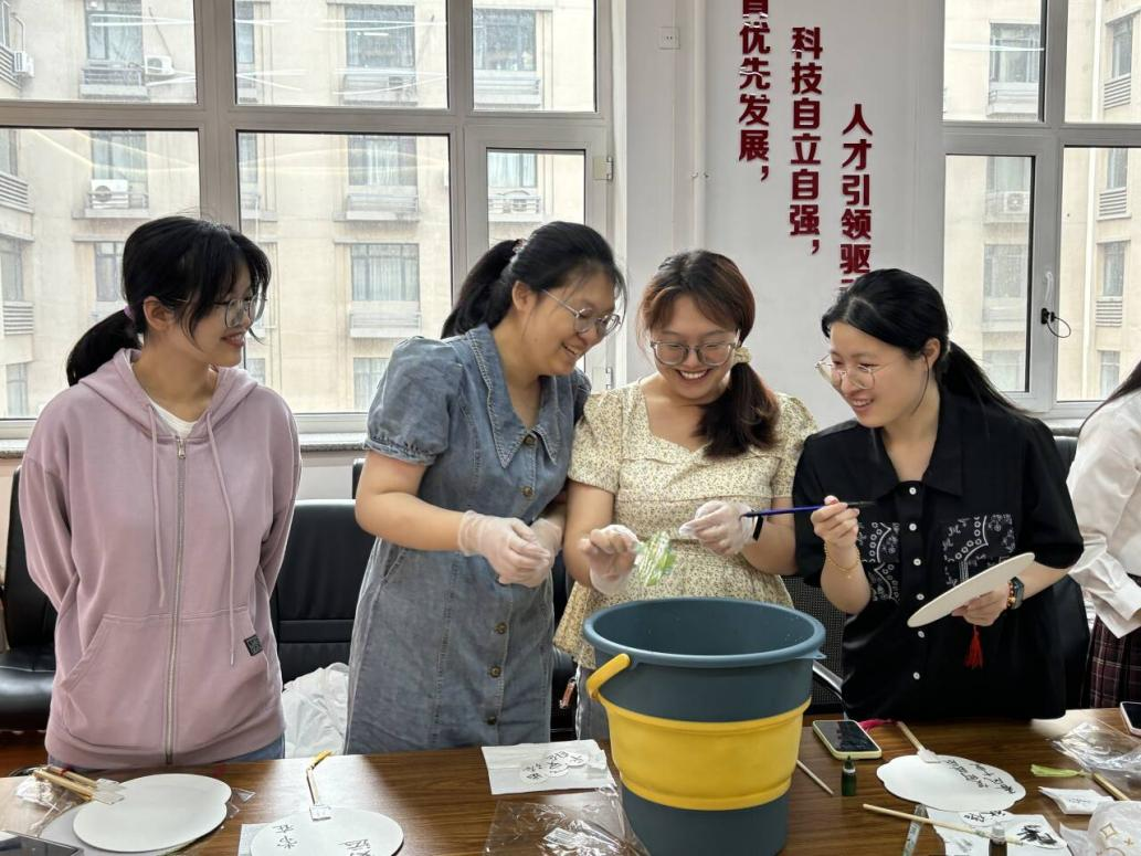 活动现场,工作人员准备了多种形状的空白扇子和颜料,并耐心为同学们介绍了漆扇制作的方法。同学们精心挑选染料滴在水桶中,随后把空白扇子浸入水中再快速提起,这样创作出独一无二的美丽漆扇。活动结束后,同学们进行了合影留念。