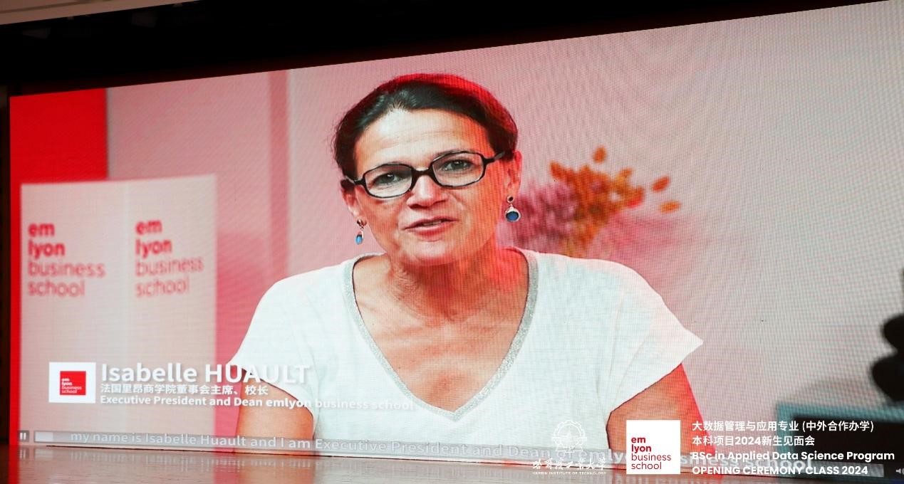 -法国里昂商学院大数据管理与应用专业本科项目(中外合作办学)新生见面会在一校区活动中心201会议室举行,法国里昂商学院校长伊莎贝拉·雨欧通过视频致辞,法国里昂商学院副校长王华、里番