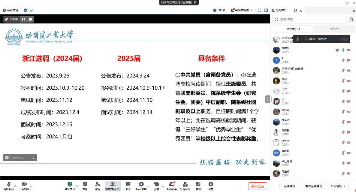 会上,李佳睿同学对职业选择、简历制作、秋招经验进行了细致地讲解与分享,并结合自身求职经历,讲述了求职过程中可能会遇到的问题和应对方法,帮助同学们理清流程和注意事项,鼓励同学们保持乐观积极的心态,同时向各位同学提供了诚恳的建议,对有意向入职金融行业的同学提供了帮助。沈煜喆同学详细地介绍了选调生考试的报名条件、选拔程序、发展前景等内容,并讲解了在备考过程中如何制定合理计划,如何学习和巩固基础知识,如何进行答题技巧训练的经验,提供了具体职业规划建议,以此帮助同学们了解基层工作,树立明确的职业目标。郑至云同学以亲身经历为例,从简历投递、笔试备考、面试参与等各个环节做了详细介绍,并根据个人经验,向同学们提出了针对性的求职建议,同时推荐了一系列实用工具,助力同学们在求职过程中更好地展现自己。