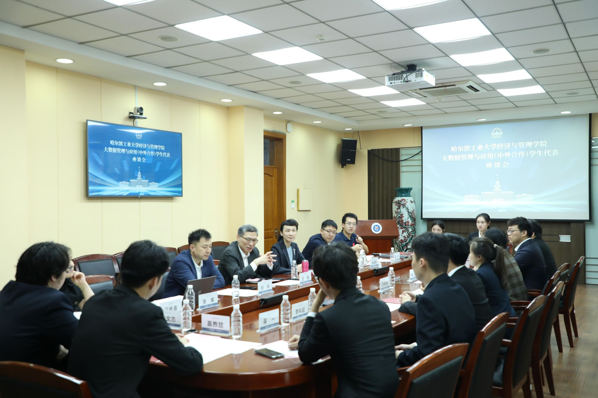 在管理楼G216会议室召开大数据管理与应用(中外合作)专业学生代表座谈会,学院院长王健、党委书记孟炎、党委副书记徐建慧、院长助理刘洋出席座谈会。首届大数据管理与应用(中外合作)专业学生辅导员张俊主持座谈会。