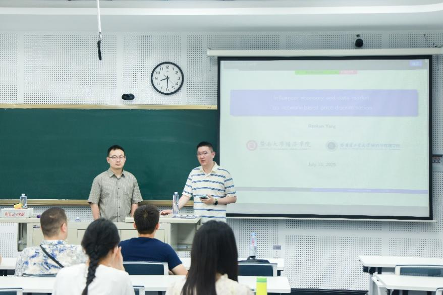 助理研究员吴迪主持。暨南大学助理教授杨仁琨带来题为“Influencer economy and the market of social data”的精彩讲座。他系统讲解了社交媒体平台中影响力经济的运作机制,深入解析了社交数据的生成路径、平台对用户行为数据的定价机制。