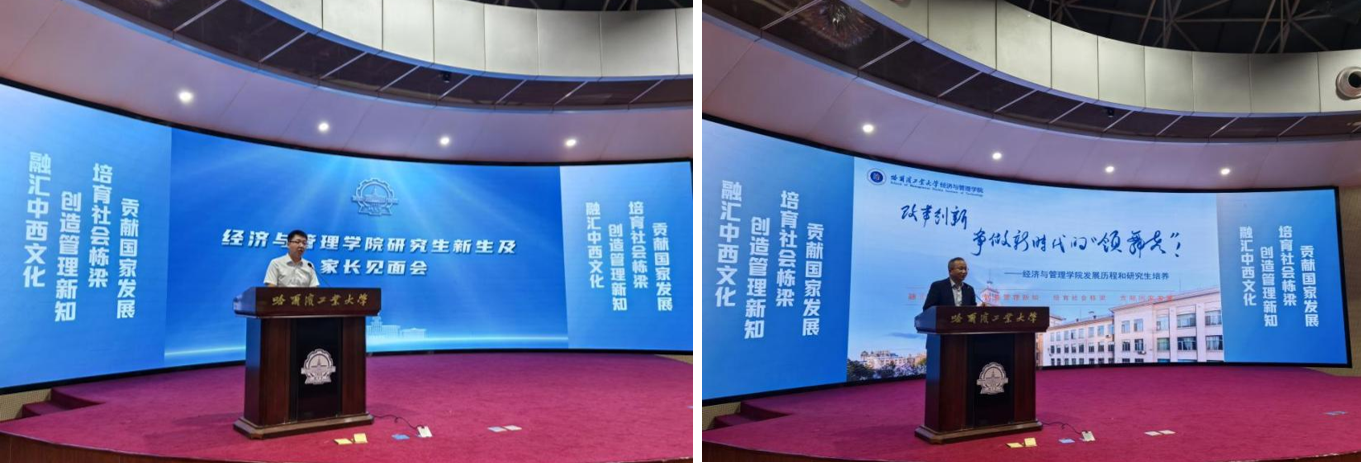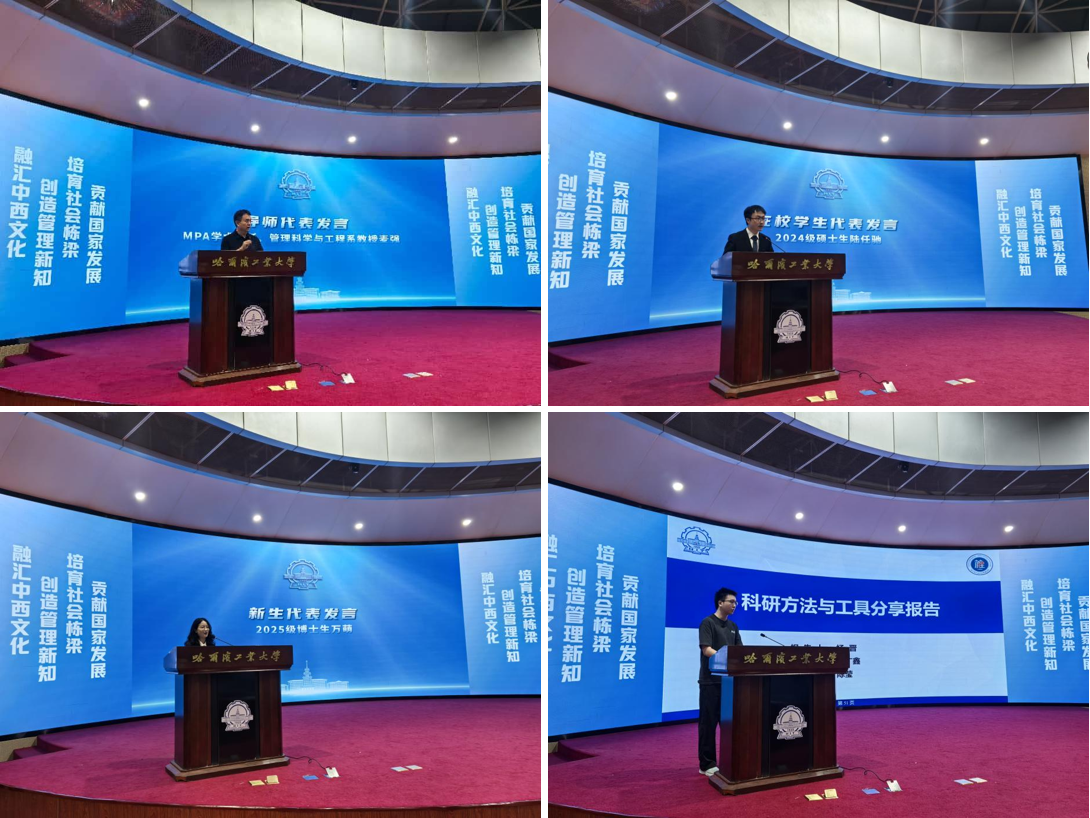 会上,副院长赵泽斌对全体研究生新生及家长亲友的到来表示热烈的欢迎,并围绕全日制硕博研究生以及MPA的培养要求进行详细讲解和说明。MPA学术中心主任麦强寄语研究生同学们坚守初心、胸怀家国,在不断地钻研攻坚中积累真才实学,把个人发展方向与国家战略需求紧密相连,用实际行动践行奉献担当。在校学生代表陆任驰结合自身求学经历分享了对研究生学习生活的理解,并鼓励同学们站在人生新起点上,将青春力量融入服务国家和社会发展的浪潮中。新生代表万萌表示,在未来的学习生活中,将时刻秉承校训精神,以哈工大人的责任担当迎接挑战,把青春理想融入学术追求,将个人的成长嵌入时代的发展,奋力书写服务国家发展的学术答卷。最后,博士生杨晋结合自身科研学术经历,分享了从选定研究方向,到如何开展研究等科研学术全链条发展过程。