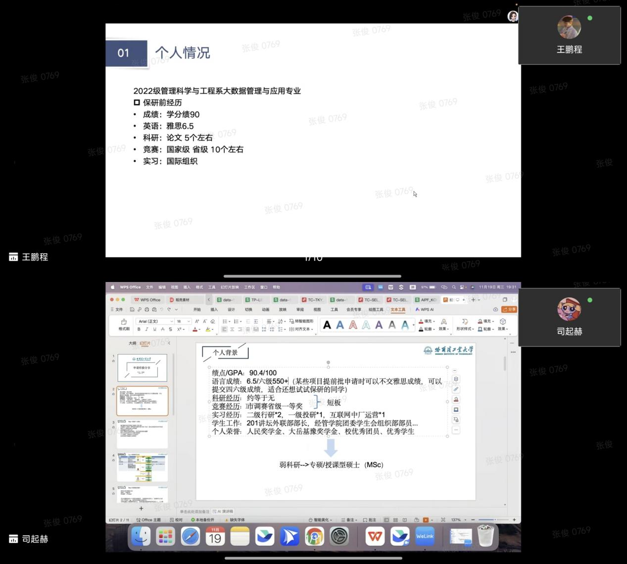 司起赫介绍了自己的学业背景、语言成绩和实习经历,系统讲解了留学申请的整体时间线与关键准备内容。重点分享了授课型硕士项目的择校逻辑、文书撰写要点,以及笔试与面试的常见题型与应对策略。她提醒同学们在申请过程中要结合职业目标进行选择,在面试中则要结构化展示个人竞争力,以提升录取机会。