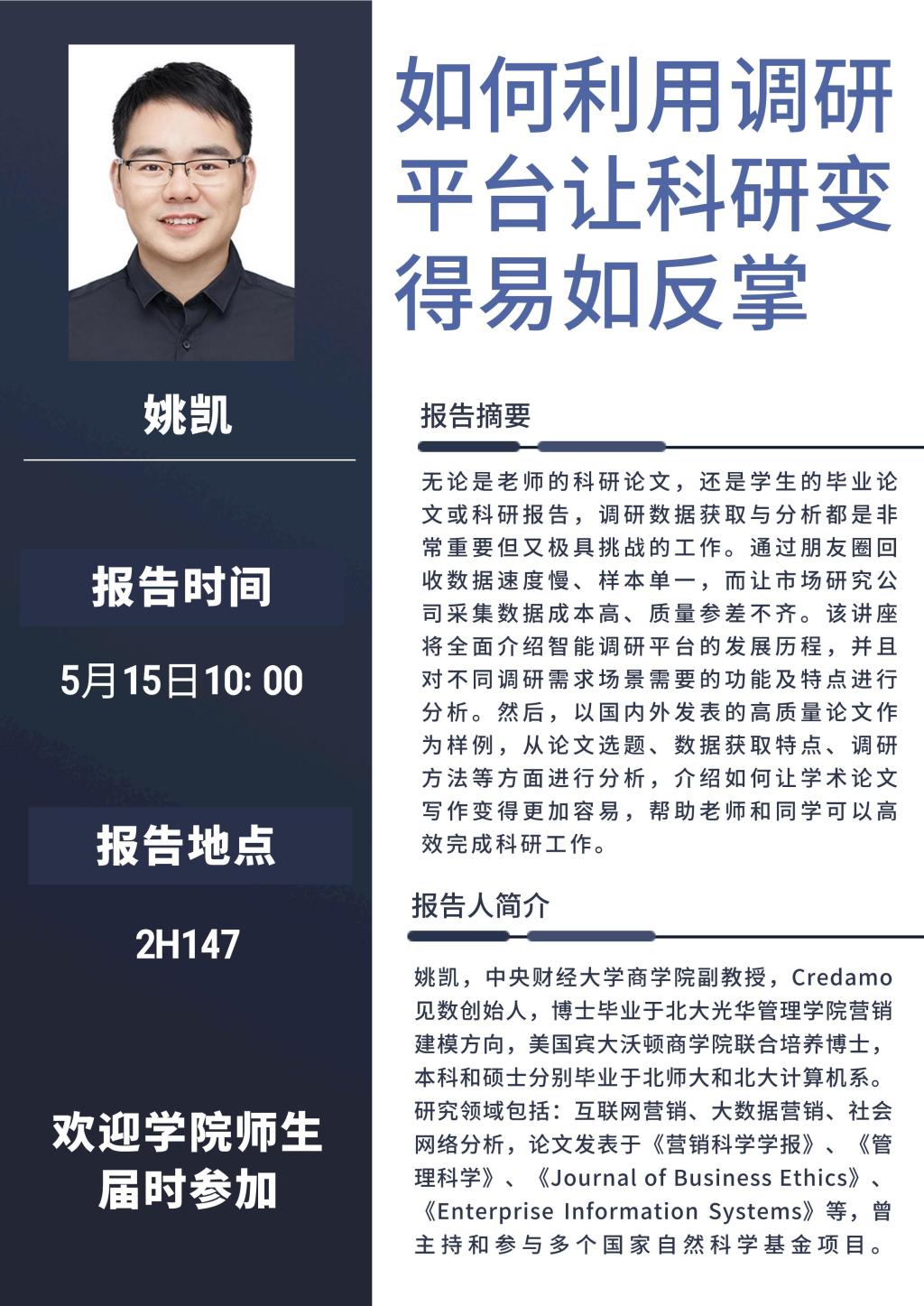 无论是老师的科研论文,还是学生的毕业论文或科研报告,调研数据获取与分析都是非常重要但又极具挑战的工作。通过朋友圈回收数据速度慢、样本单一,而让市场研究公司采集数据成本高、质量参差不齐。该讲座将全面介绍智能调研平台的发展历程,并且对不同调研需求场景需要的功能及特点进行分析。然后,以国内外发表的高质量论文作为样例,从论文选题、数据获取特点、调研方法等方面进行分析,介绍如何让学术论文写作变得更加容易,帮助老师和同学可以高效完成科研工作。