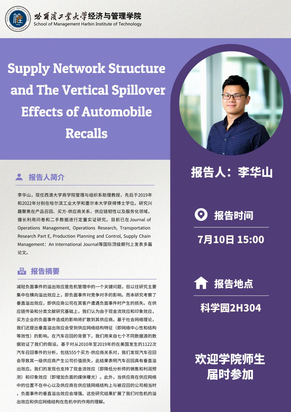 报告题目:Supply Network Structure and The Vertical Spillover Effects of Automobile Recalls