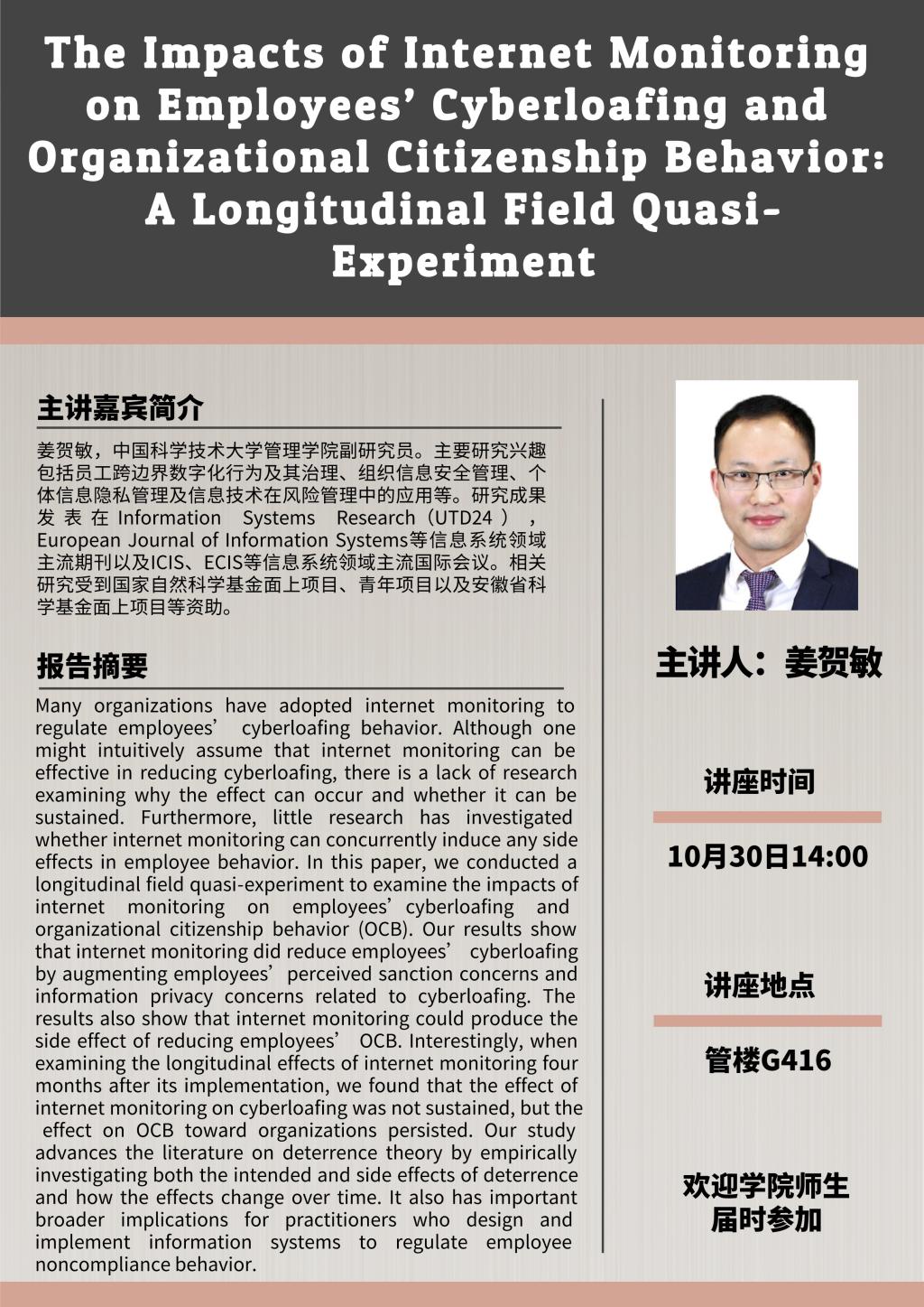 报告题目:The Impacts of Internet Monitoring on Employees’ Cyberloafing and Organizational Citizenship Behavior: A Longitudinal Field Quasi-Experiment