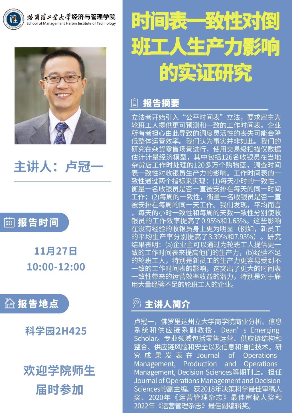 卢冠一,佛罗里达州立大学商学院商业分析、信息系统和供应链系副教授,Dean’s Emerging Scholar。专业领域包括零售运营、供应链结构和整合、供应链风险和安全以及信息和通信技术。研究成果发表在Journal of Operations Management, Production and Operations Management, Decision Sciences等期刊上。担任Journal of Operations Management and Decision Sciences的副主编。获2018年决策科学最佳审稿人奖、2020年《运营管理杂志》最佳审稿人奖和2022年《运营管理杂志》最佳副编辑奖。