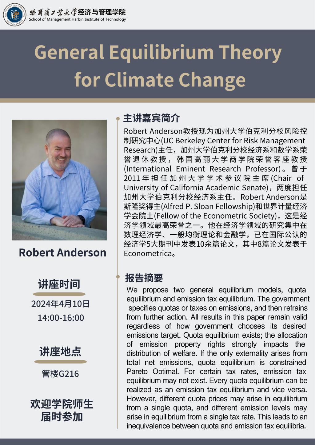 Anderson教授现为加州大学伯克利分校风险控制研究中心(UC Berkeley Center for Risk Management Research)主任,加州大学伯克利分校经济系和数学系荣誉退休教授,韩国高丽大学商学院荣誉客座教授(International Eminent Research Professor)。曾于2011年担任加州大学学术参议院主席(Chair of University of California Academic Senate),两度担任加州大学伯克利分校经济系主任。Robert Anderson是斯隆奖得主(Alfred P. Sloan Fellowship)和世界计量经济学会院士(Fellow of the Econometric Society),这是经济学领域最高荣誉之一。他在经济学领域的研究集中在数理经济学、一般均衡理论和金融学,已在国际公认的经济学5大期刊中发表10余篇论文,其中8篇论文发表于Econometrica。