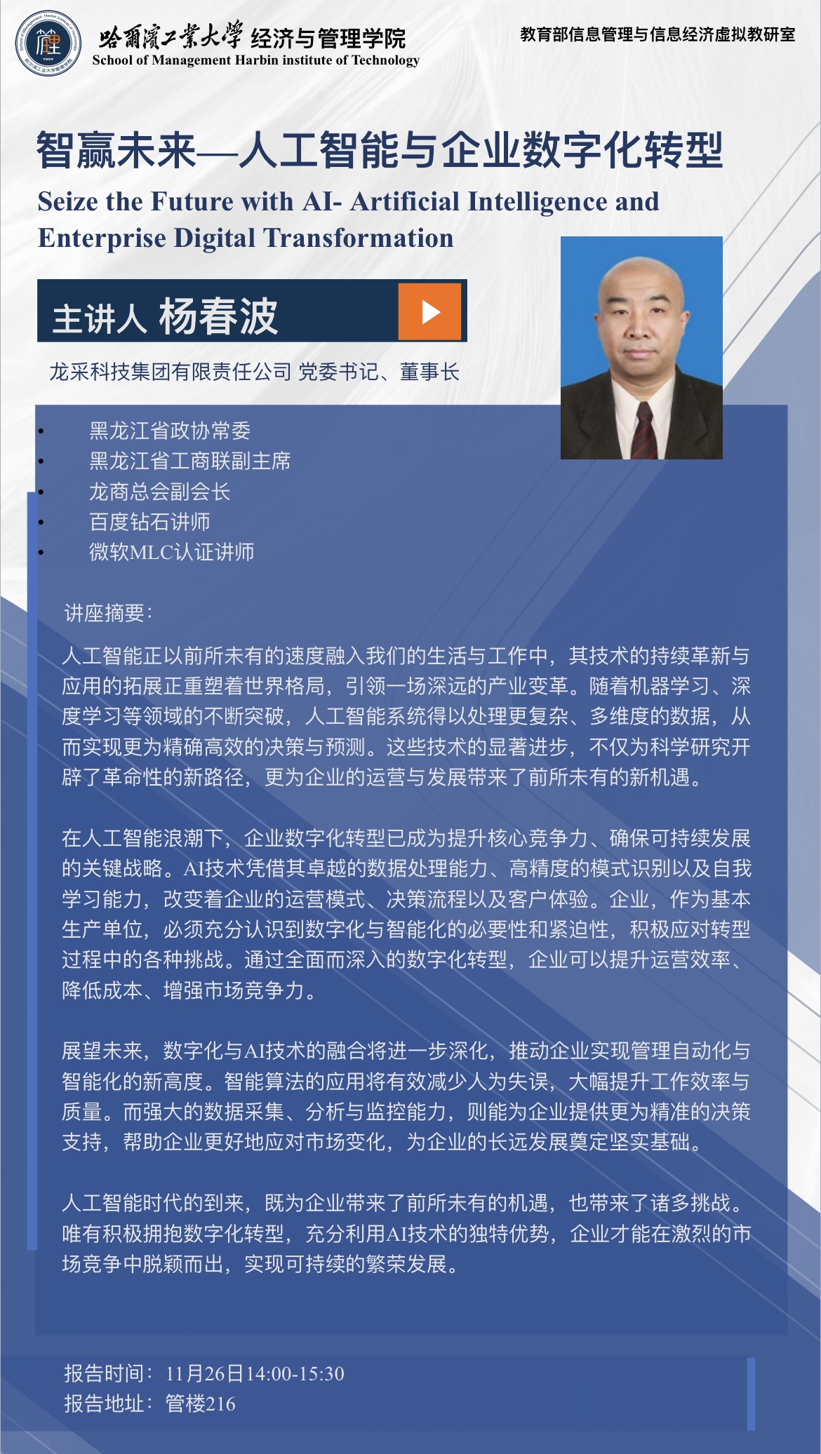 杨春波,龙采科技集团党委书记、董事长,黑龙江省政协常委、黑龙江省工商联副主席、龙商总会副会长、百度钻石讲师、微软MLC认证讲师。