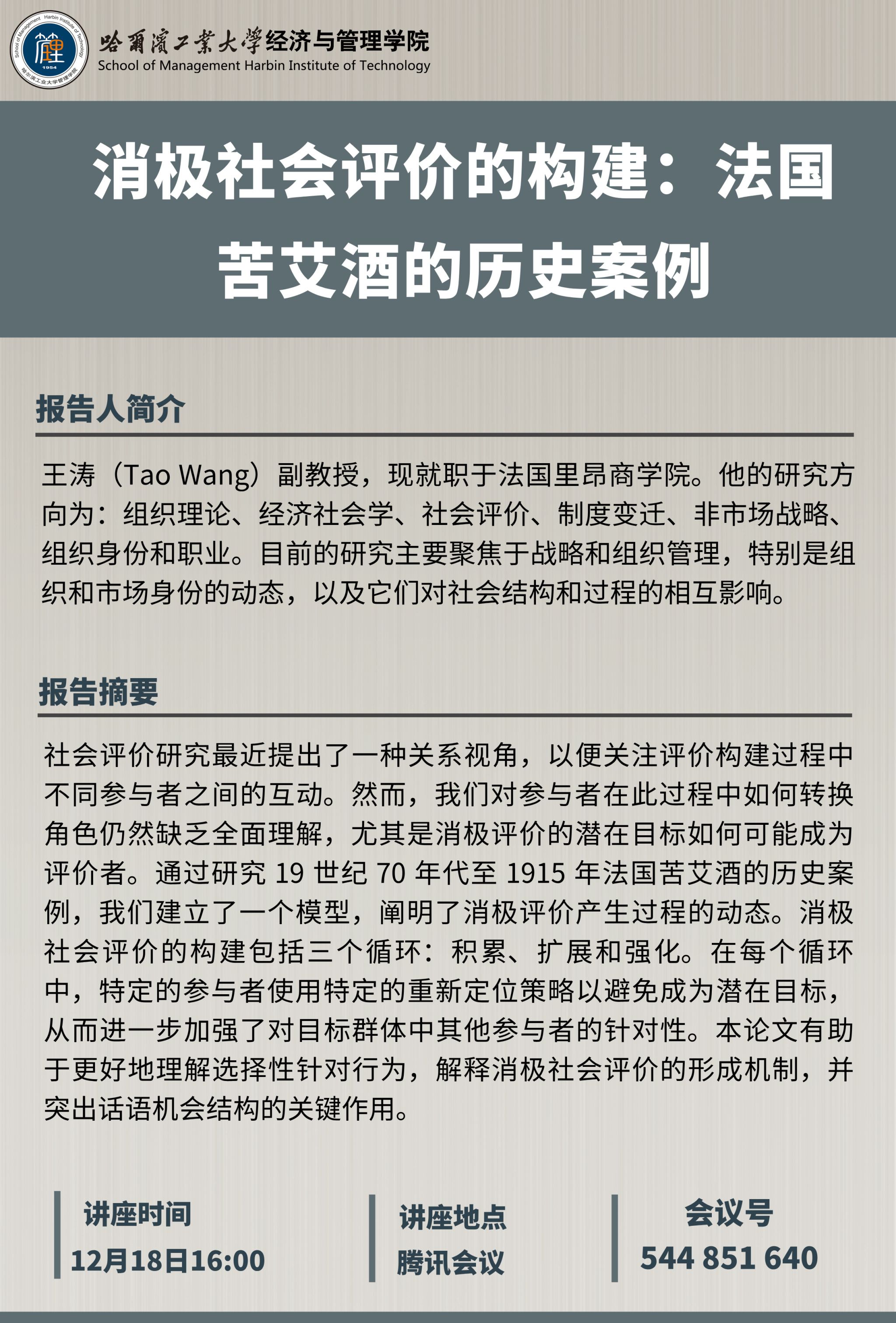 报告题目:消极社会评价的构建:法国苦艾酒的历史案例