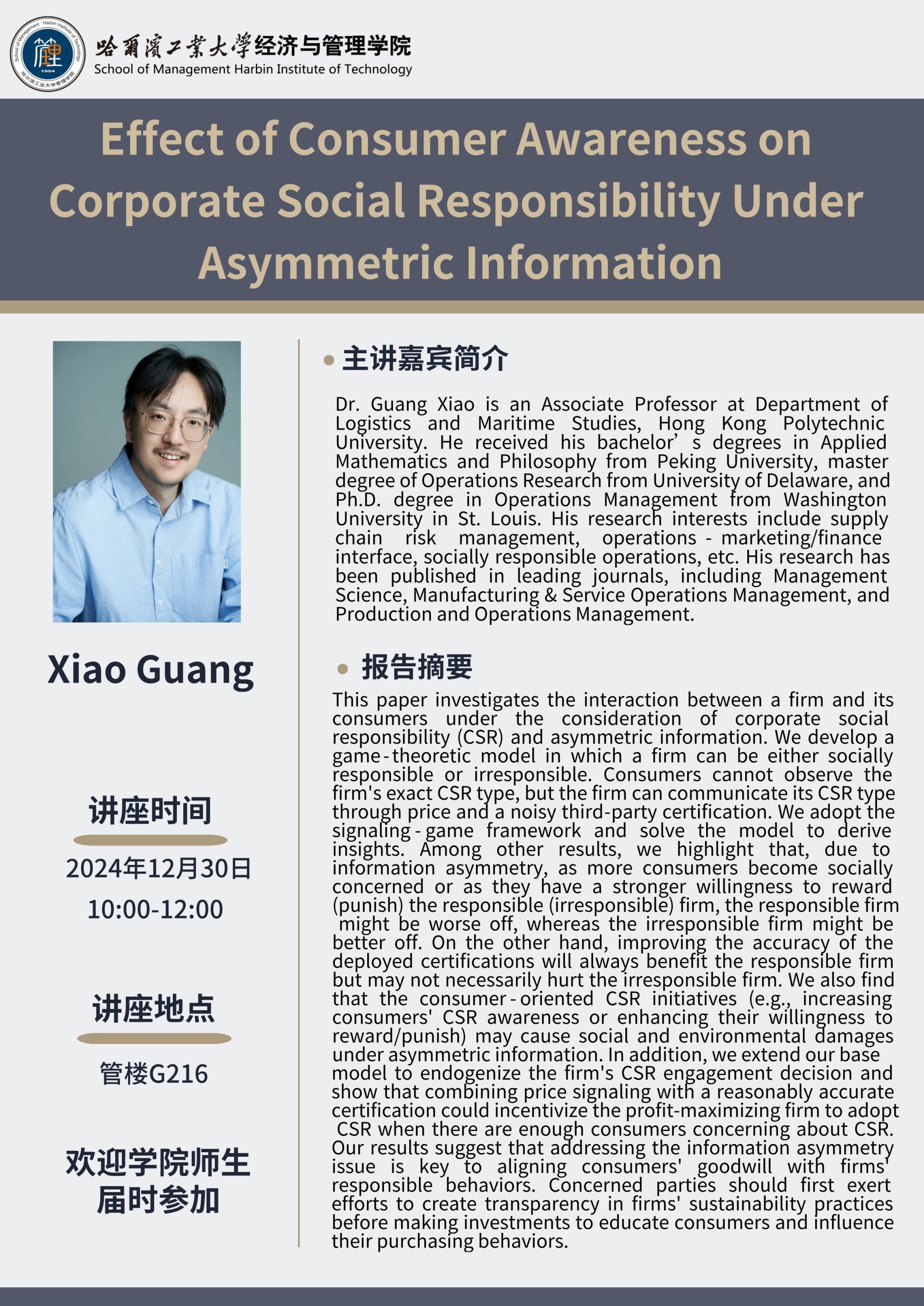 Dr. Guang Xiao is an Associate Professor at Department of Logistics and Maritime Studies, Hong Kong Polytechnic University. He received his bachelor’s degrees in Applied Mathematics and Philosophy from Peking University, master degree of Operations Research from University of Delaware, and Ph.D. degree in Operations Management from Washington University in St. Louis. His research interests include supply chain risk management, operations-marketing/finance interface, socially responsible operations, etc. His research has been published in leading journals, including Management Science, Manufacturing & Service Operations Management, and Production and Operations Management.