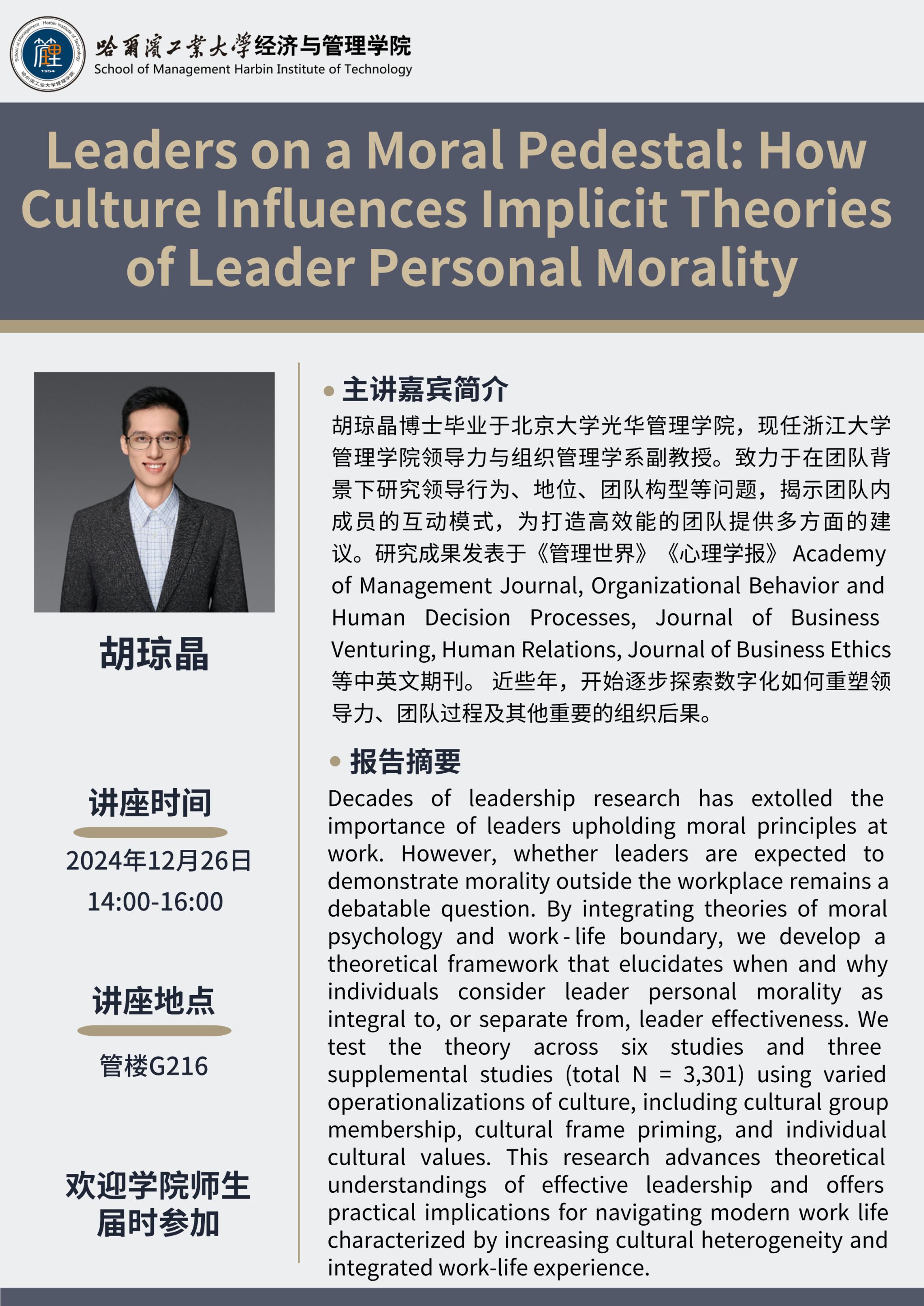 报告题目:Leaders on a Moral Pedestal: How Culture Influences Implicit Theories of Leader Personal Morality