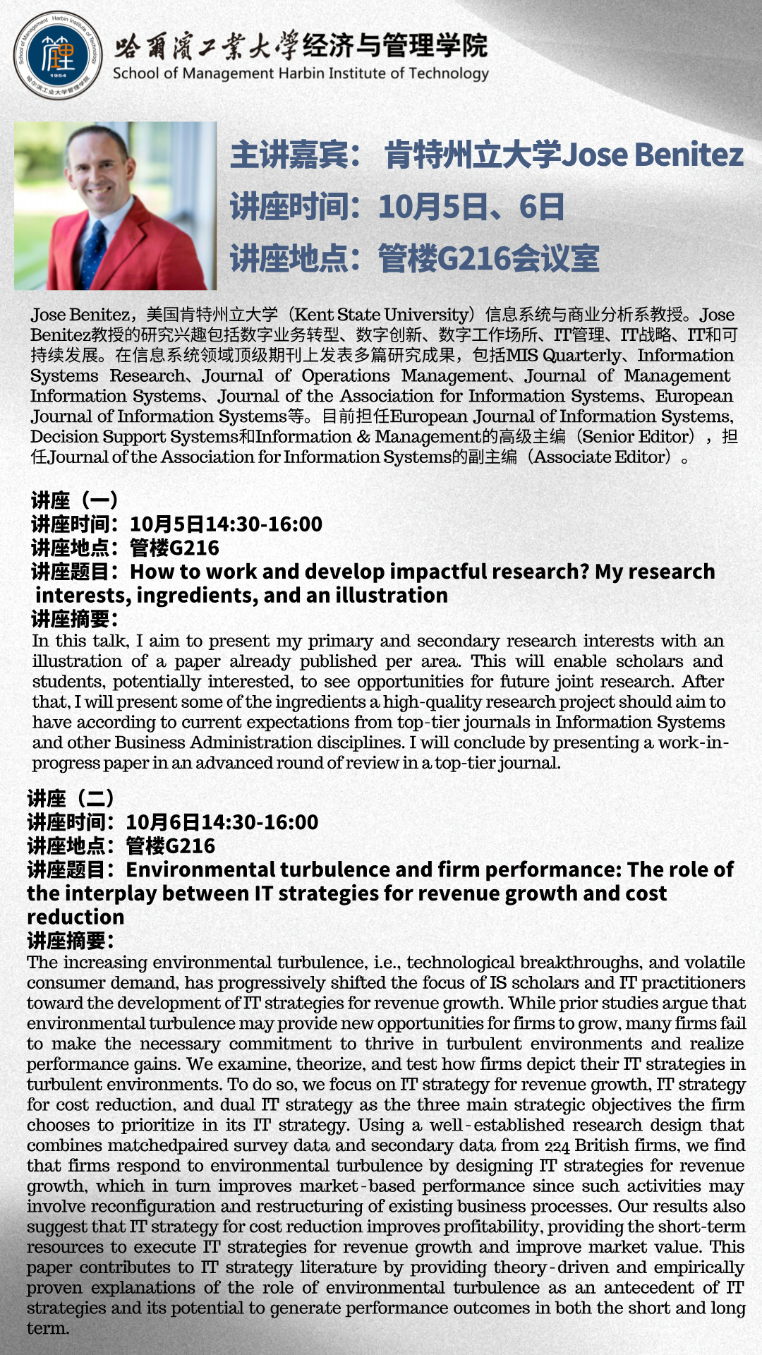 Jose Benitez,美国肯特州立大学(Kent State University)信息系统与商业分析系教授。Jose Benitez教授的研究兴趣包括数字业务转型、数字创新、数字工作场所、IT管理、IT战略、IT和可持续发展。在信息系统领域顶级期刊上发表多篇研究成果,包括MIS Quarterly、Information Systems Research、Journal of Operations Management、Journal of Management Information Systems、Journal of the Association for Information Systems、European Journal of Information Systems等。目前担任European Journal of Information Systems, Decision Support Systems和Information & Management的高级主编(Senior Editor),担任Journal of the Association for Information Systems的副主编(Associate Editor)。