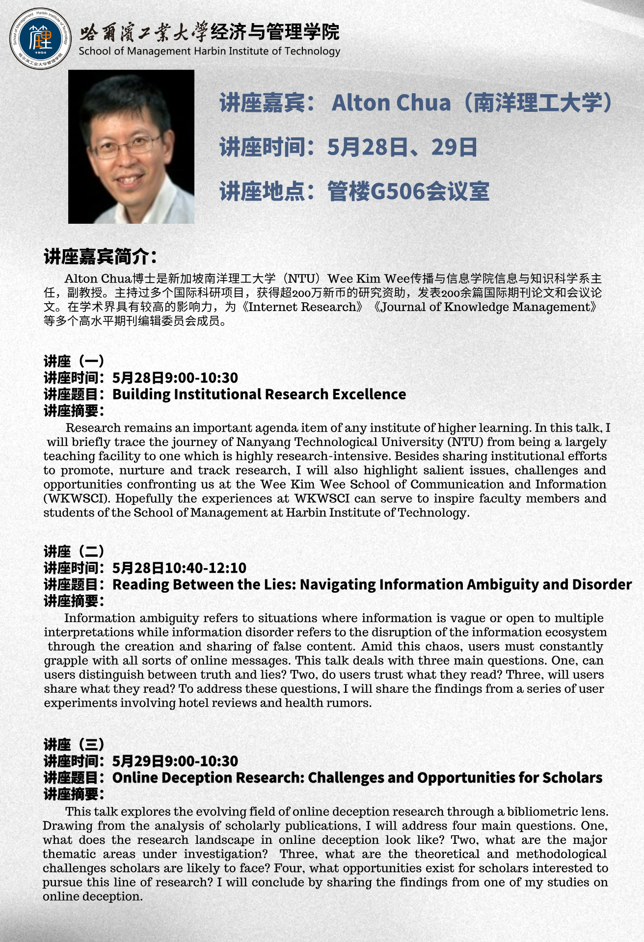 Research remains an important agenda item of any institute of higher learning. In this talk, I will briefly trace the journey of Nanyang Technological University (NTU) from being a largely teaching facility to one which is highly research-intensive. Besides sharing institutional efforts to promote, nurture and track research, I will also highlight salient issues, challenges and opportunities confronting us at the Wee Kim Wee School of Communication and Information (WKWSCI). Hopefully the experiences at WKWSCI can serve to inspire faculty members and students of the School of Management at Harbin Institute of Technology.