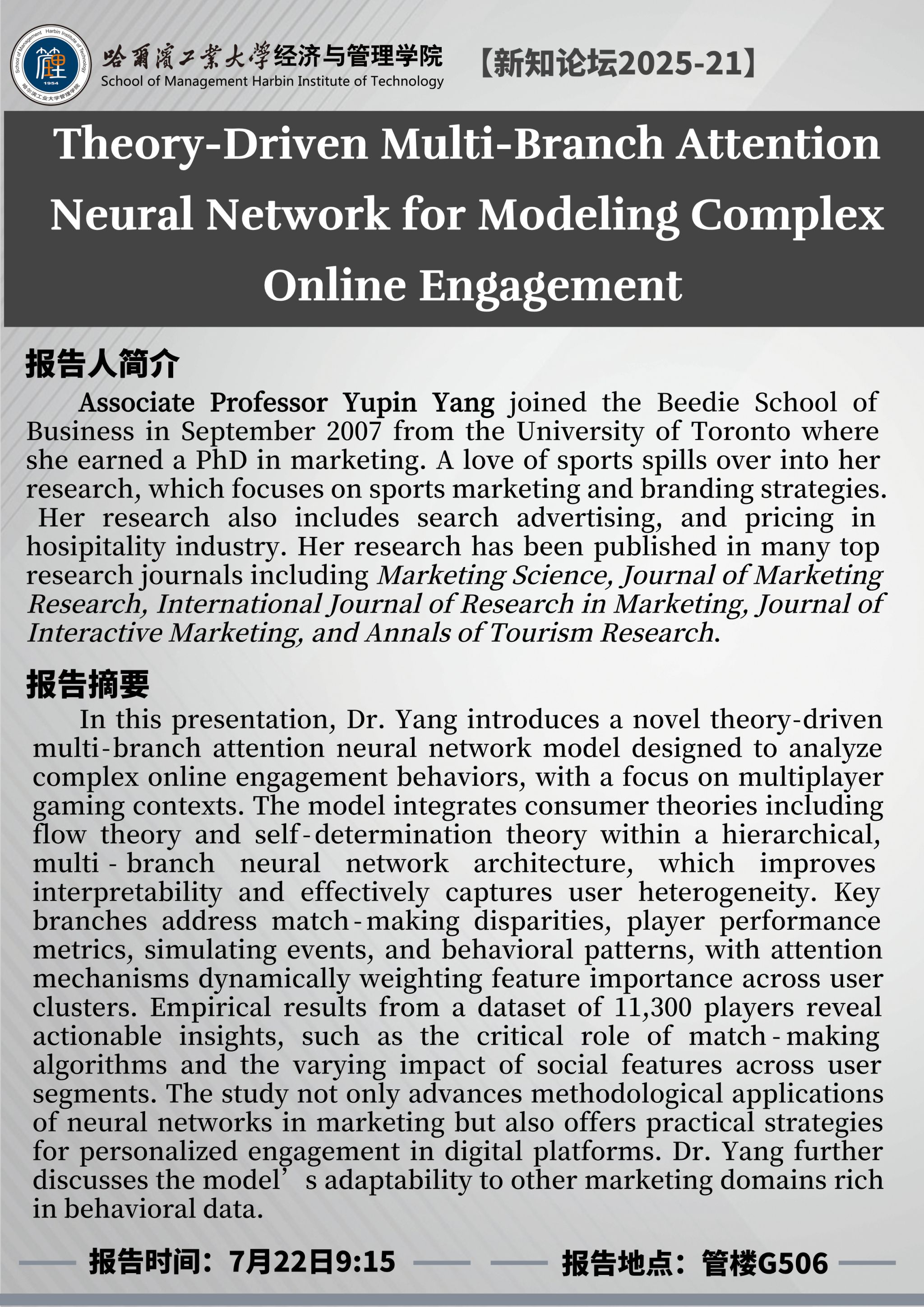 讲座主题:Theory-Driven Multi-Branch Attention Neural Network for Modeling Complex Online Engagement