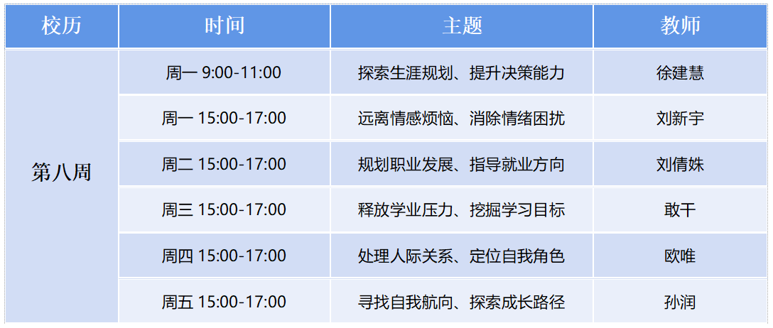 为充分发挥心理辅导站的服务功能,让心理辅导站成为学生放松心情,启迪智慧的乐园,辅导站采取教师值班咨询制。现将“心语轩”二级心理辅导站第8周咨询室安排公布如下: